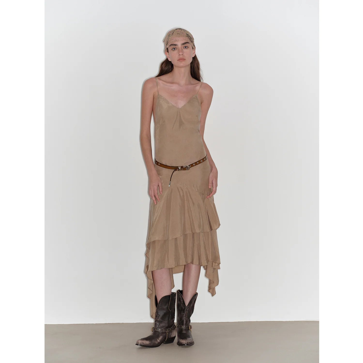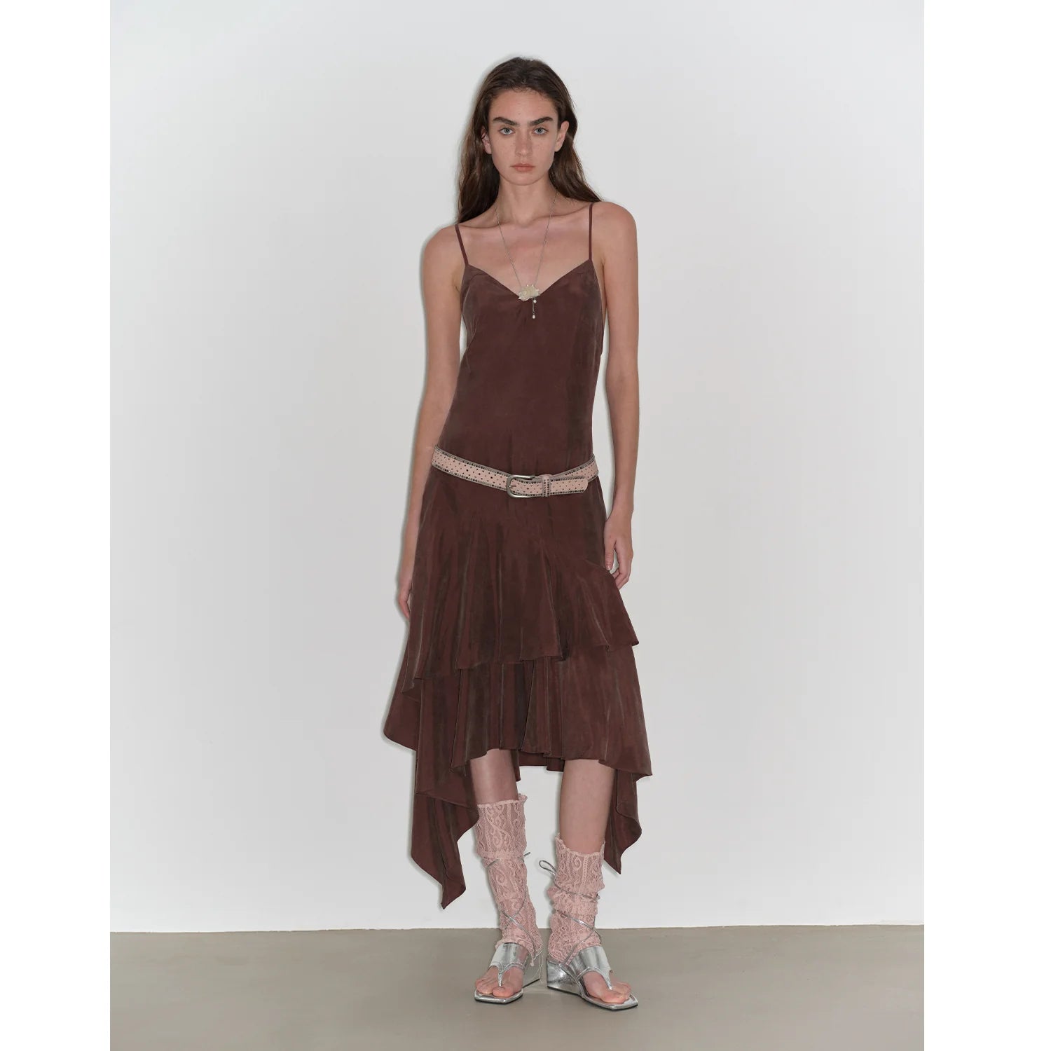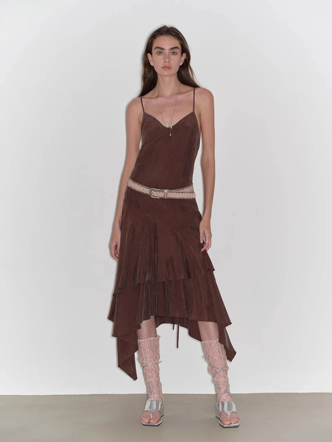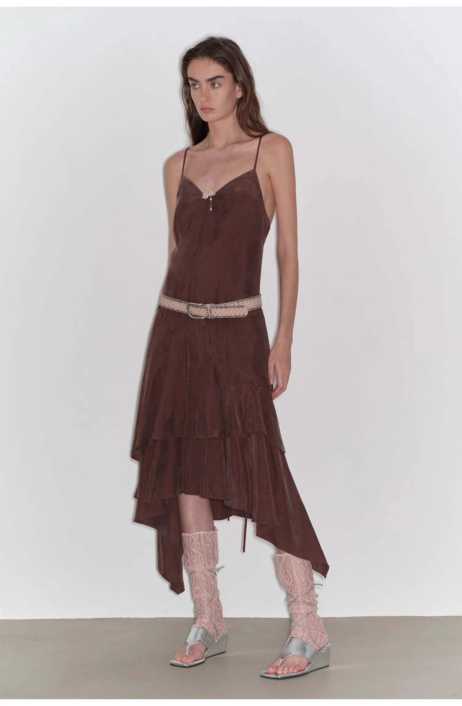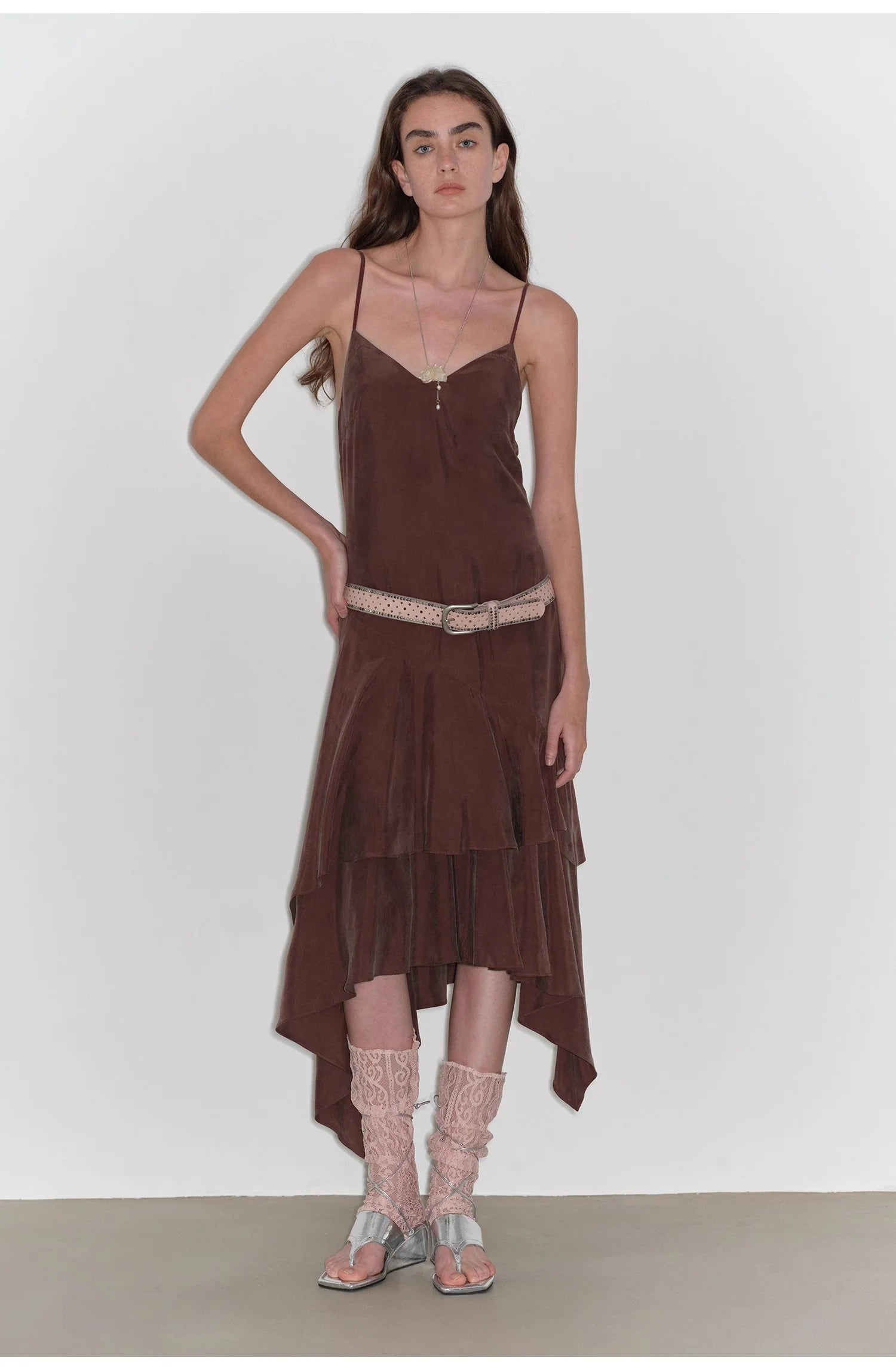 "Heart-Beating Invitation" Lazy Copper-Ammonia Rayon V-Neck Irregular Adjustable Mid-Length Suspender Dress