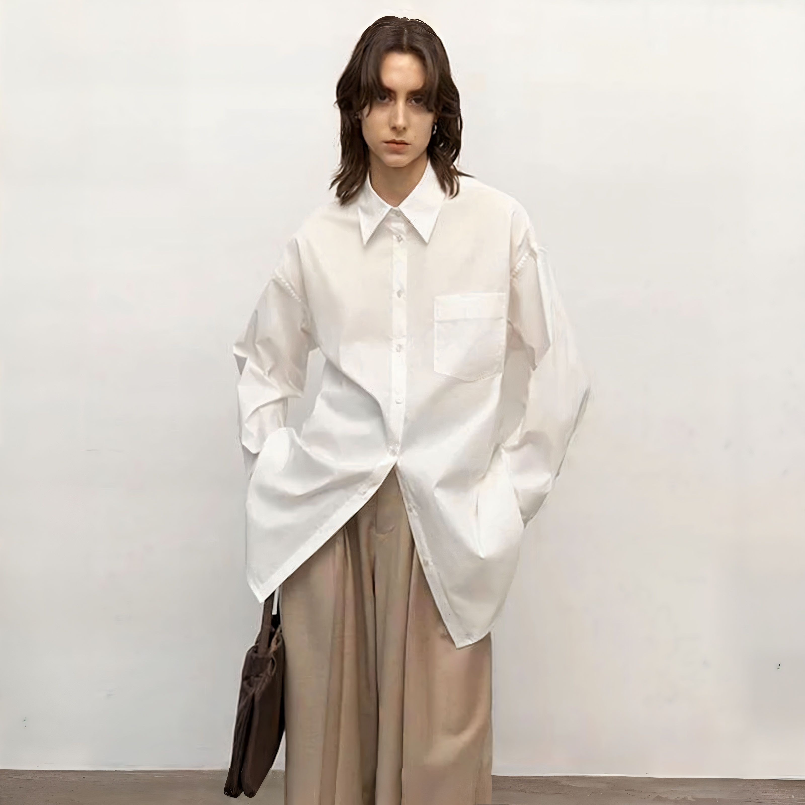 Casual classic drop shoulder shirt Experience the refined elegance of the "Heart's Desire" shirt, crafted from high-density nylon cotton that combines durability with a soft touch. Its three-dimensional loose tailoring and large drop shoulder design create an effortlessly stylish silhouette, while the thin shoulder detailing enhances a slim, elongated look. The shirt’s natural drape flows smoothly, lending an air of sophistication and grace. Designed for comfort, the relaxed fit around the upper body allows freedom of movement and a light, breathable feel, making it an ideal choice for both casual and refined occasions.