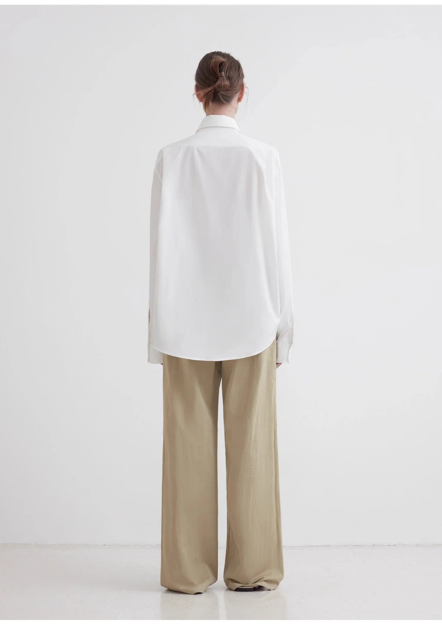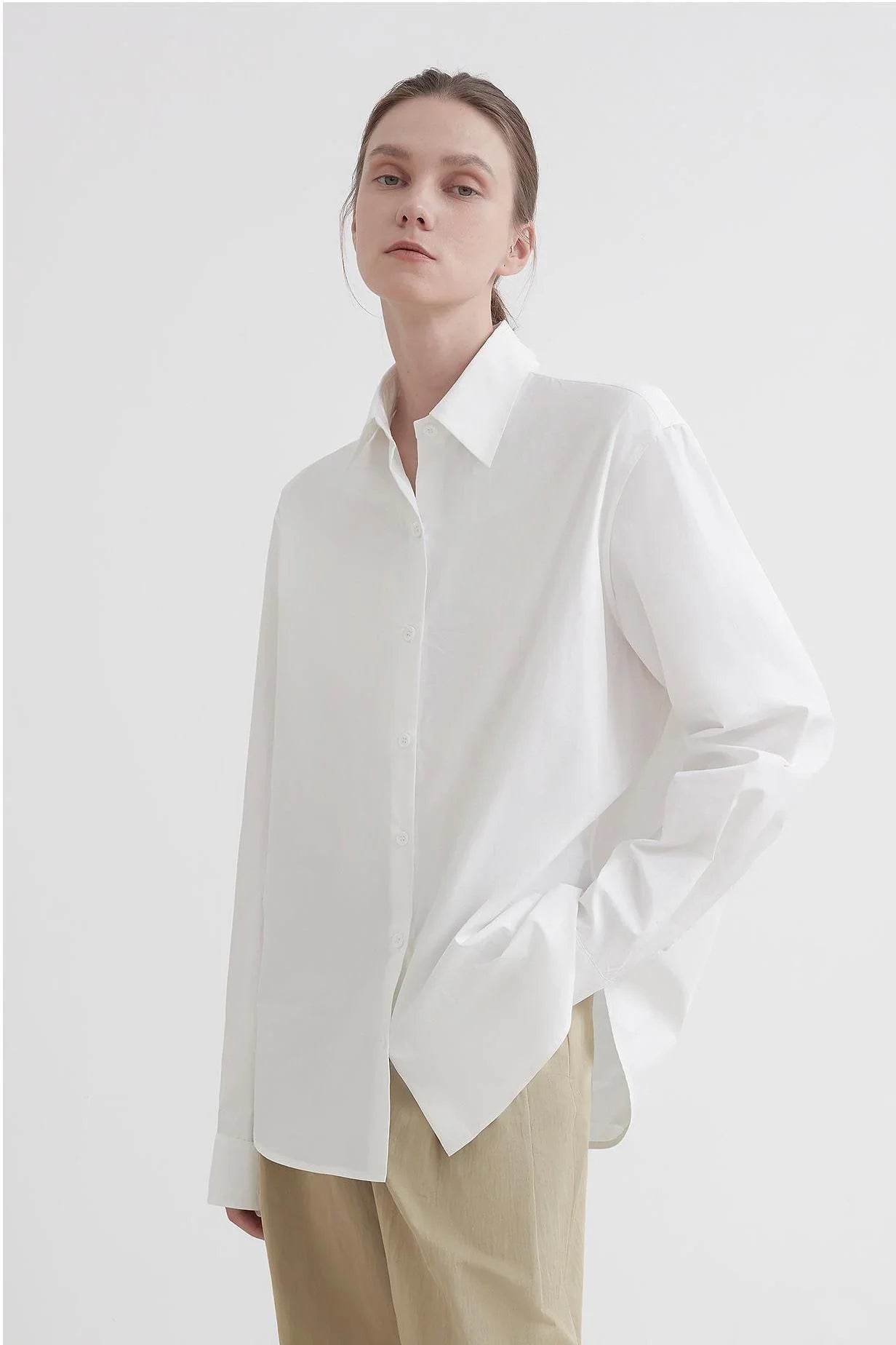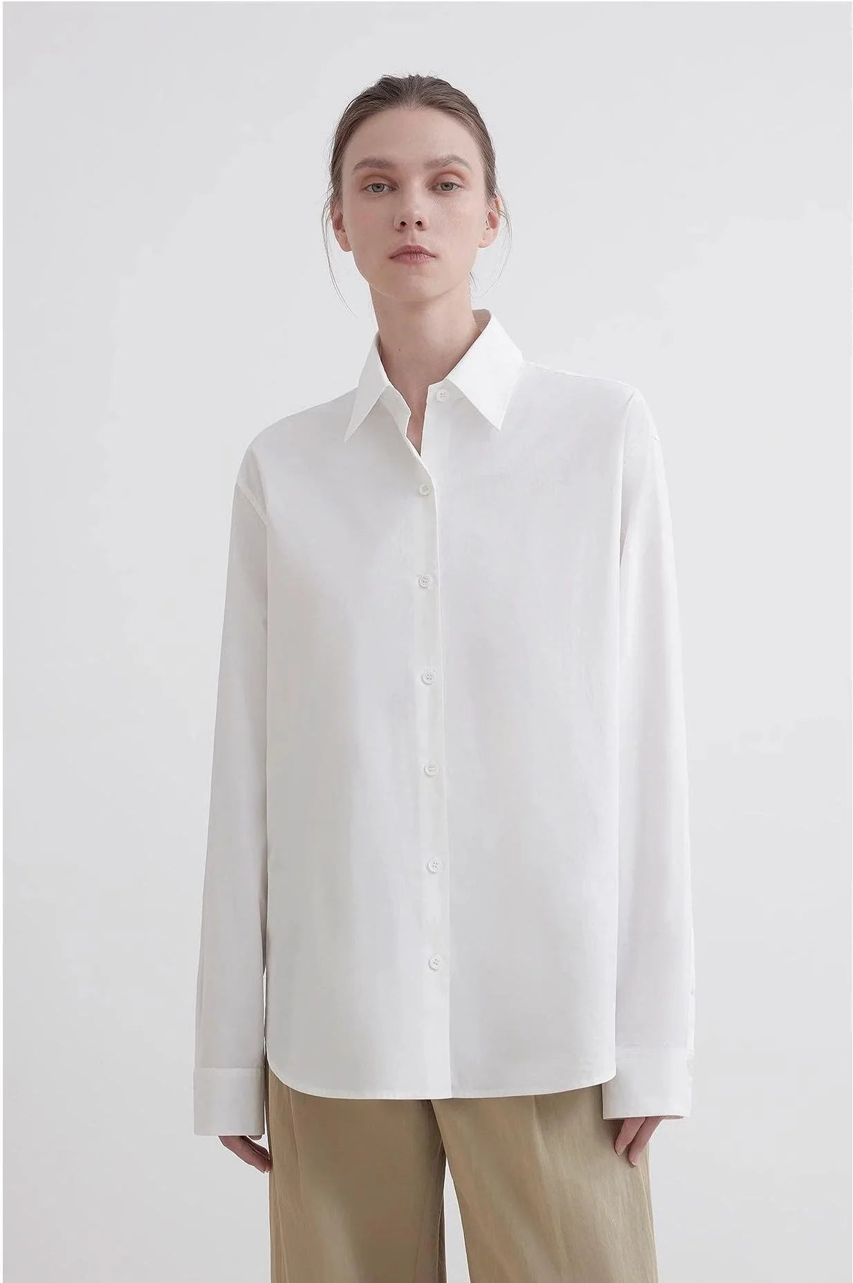 This classic, loose-fitting, straight-leg shirt design offers effortless comfort. The slightly loose silhouette allows for a relaxed, unrestricted fit, creating a comfortable, airy feel. The custom-made tailoring creates a classic lapel shape that flatters the neck without sacrificing comfort. Delicate buttons enhance the look. The straight sleeves create a simple, elegant look, flattering the shoulders and creating a powerful, sculpted silhouette. This design optimizes the head-to-shoulder ratio and emphasizes a chic, urban feel.
