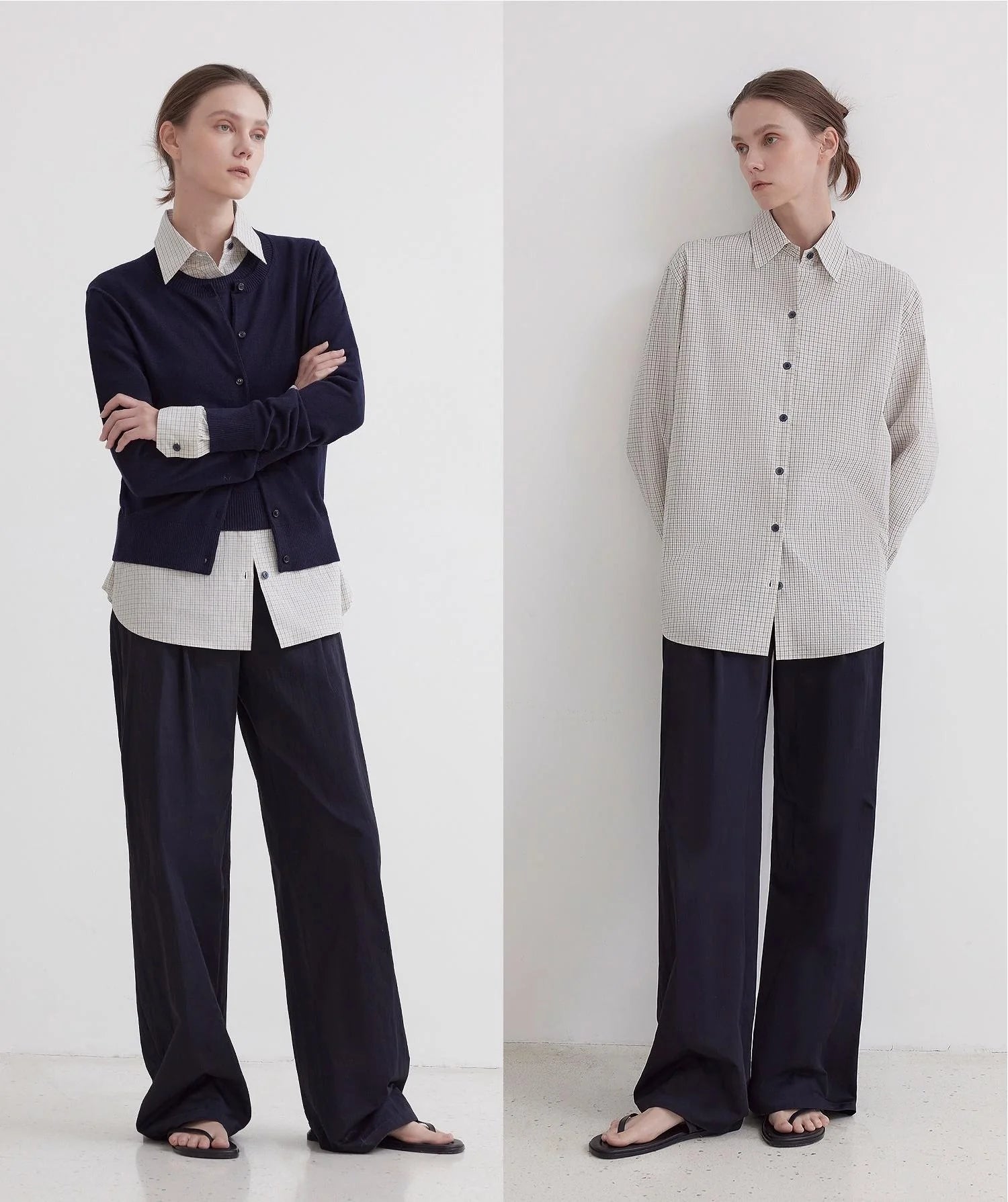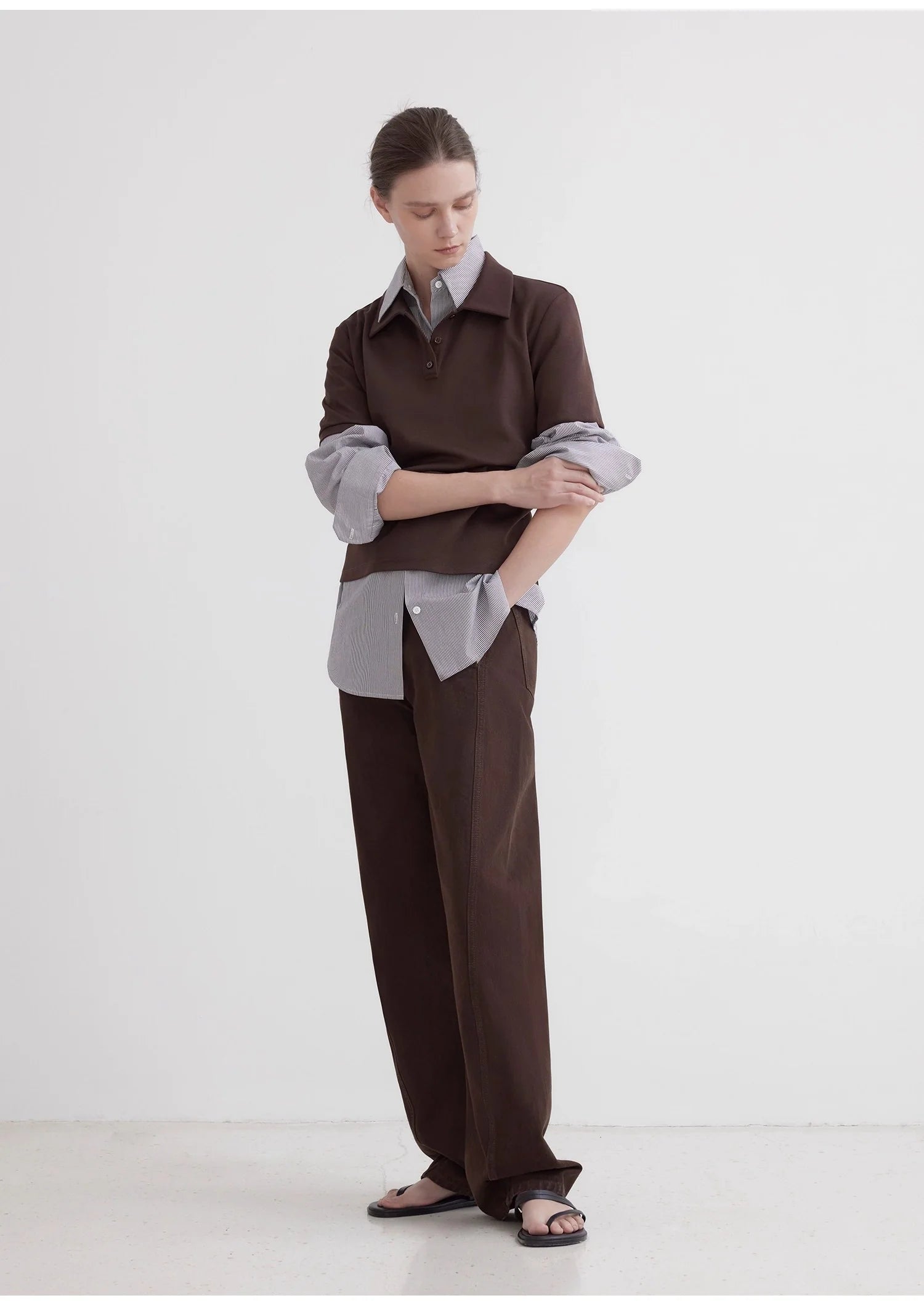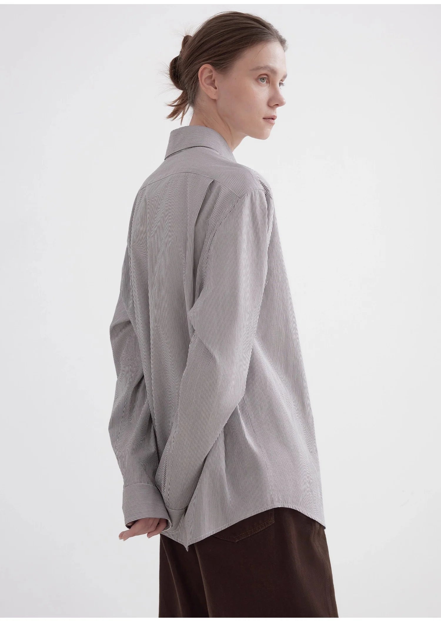 This classic, loose-fitting, straight-leg shirt design offers effortless comfort. The slightly loose silhouette allows for a relaxed, unrestricted fit, creating a comfortable, airy feel. The custom-made tailoring creates a classic lapel shape that flatters the neck without sacrificing comfort. Delicate buttons enhance the look. The straight sleeves create a simple, elegant look, flattering the shoulders and creating a powerful, sculpted silhouette. This design optimizes the head-to-shoulder ratio and emphasizes a chic, urban feel.