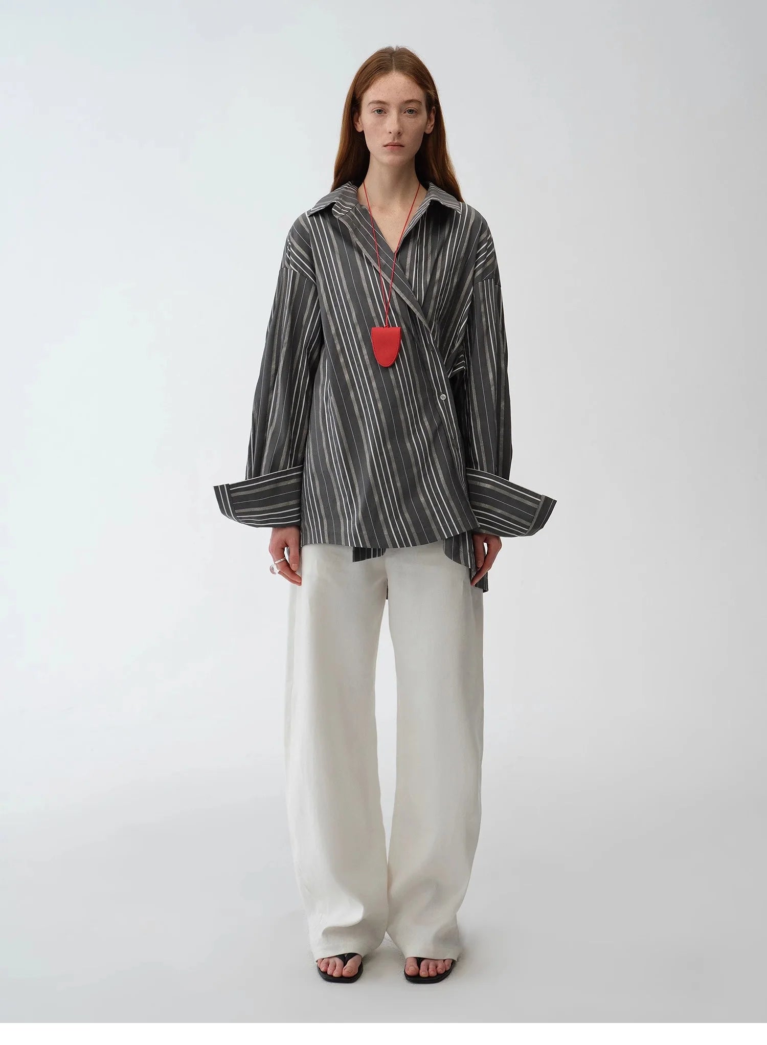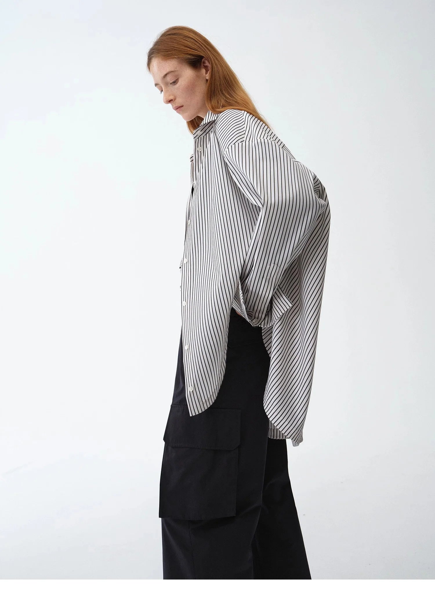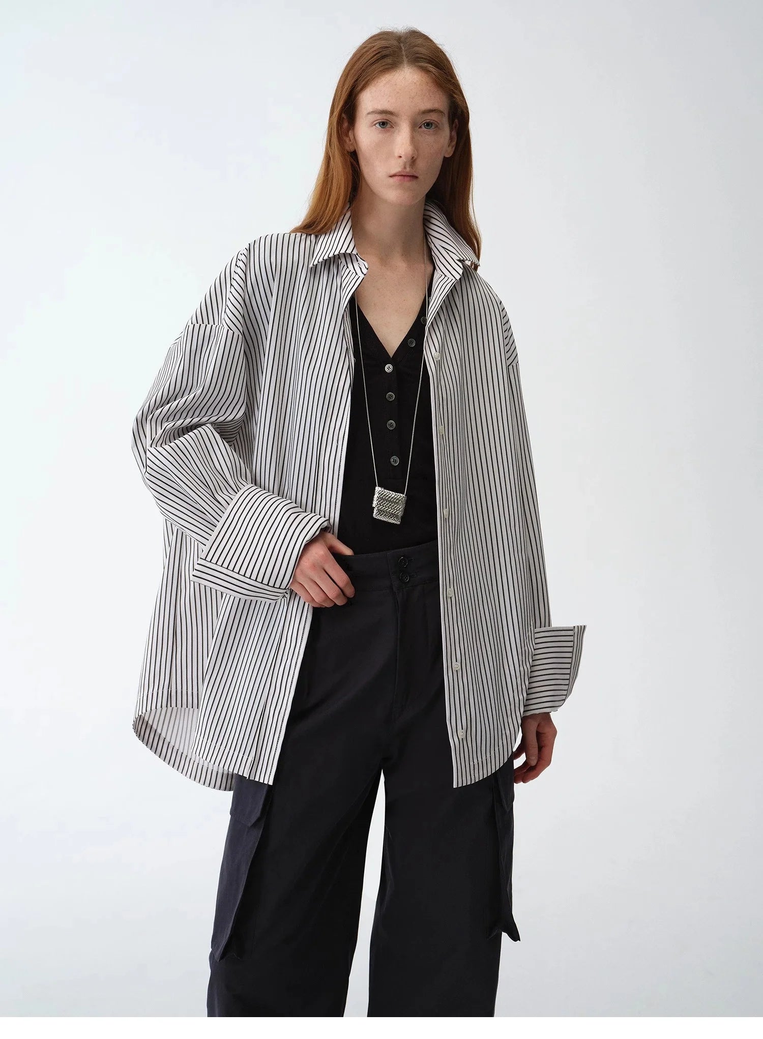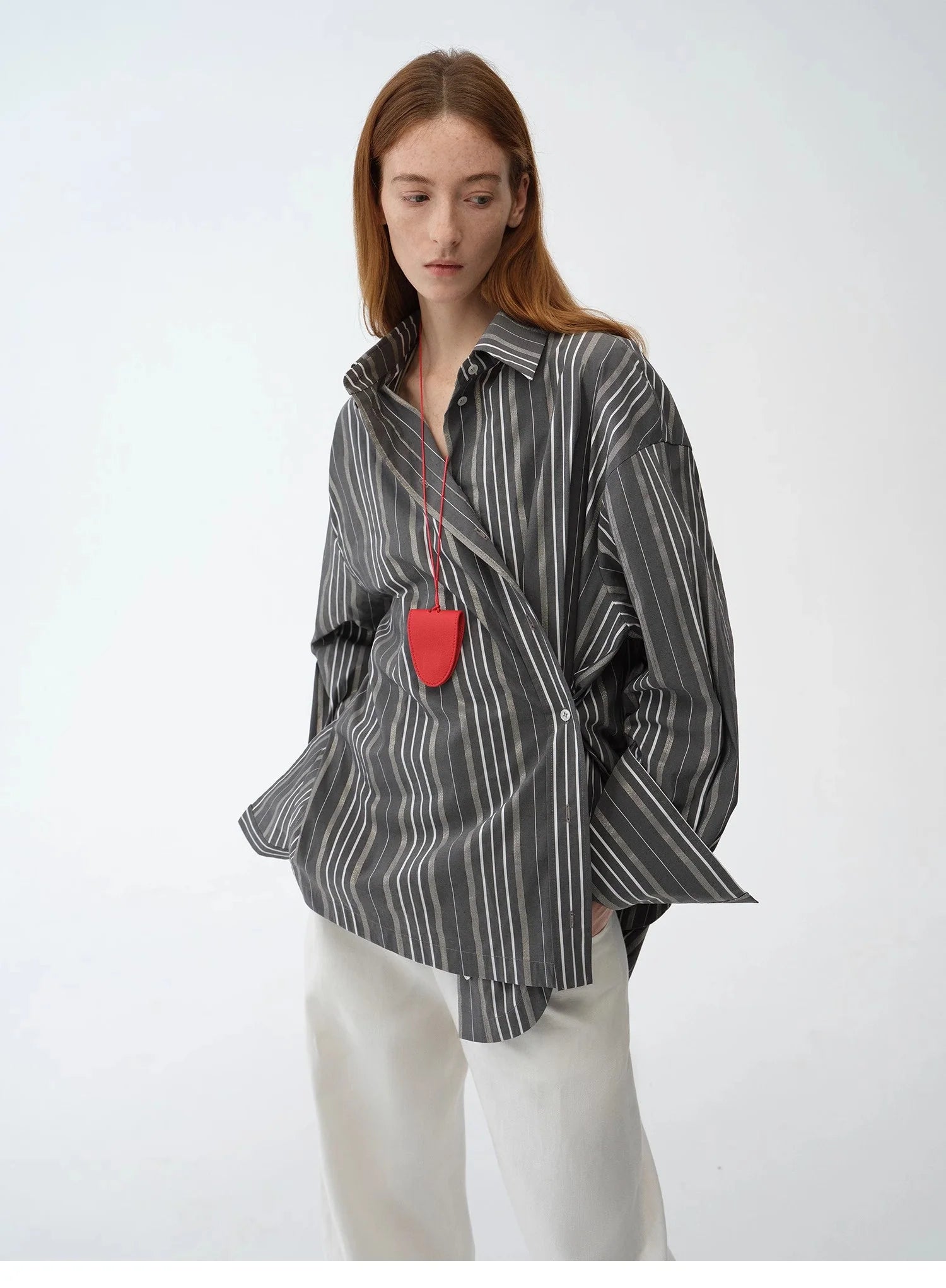 Asymmetrical slanted placket loose-fitting shirt Multiple button-down design on the waist, multiple ways to wear, easy to switch between different styles. Widened cuff design, simple to wear regularly, fashionable to fold or layer.