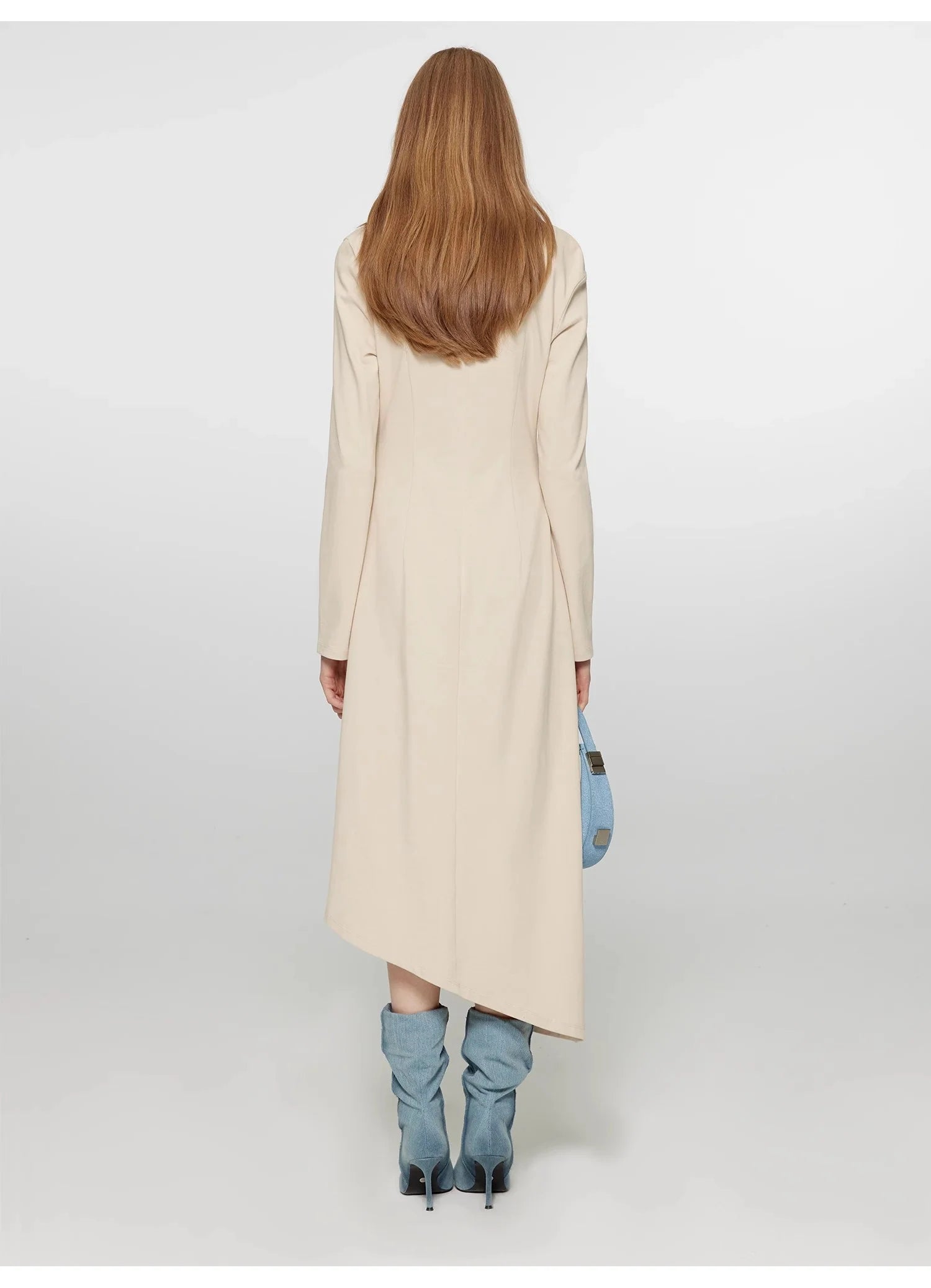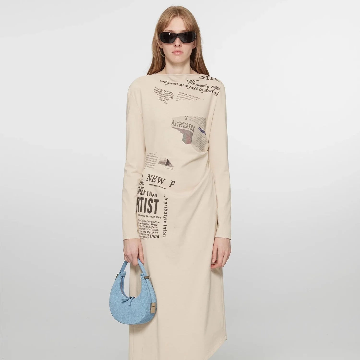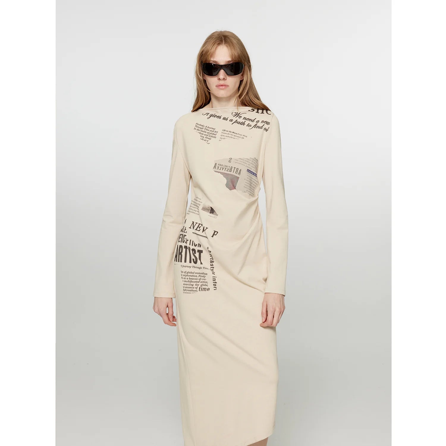 This maxi dress features a slightly slanted off-the-shoulder neckline fused with a single-side pleated cinched waist, creating asymmetrical lines for a streamlined, modern silhouette. Incorporating newspaper print elements, it blends vintage nostalgic charm with contemporary style—stylish for both solo wear and layering.